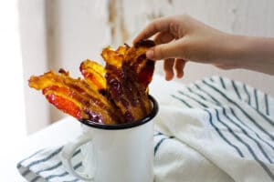 It’s great served as a snack, party food (think game day or tailgating recipes), or to give as a gift from your kitchen. It’s an easy to make candied bacon recipe that is a great addition to your get together, or even as a road trip recipe that travels well. And if you’re serving this at a gathering, a mug of my bourbon coffee alongside it is a pairing I’d stand behind every time, bourbon in the candy, bourbon in the cup.