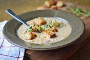 This cozy Corn Chowder with Smokey Bacon and Thyme Scented Croutons will surely warm you up. Lovely served as an appetizer or main meal, perfect for those cold days.