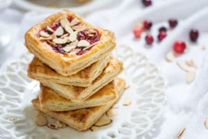 Puff Pastry dessert recipes are ideal anytime of year, and add a bit of flair to your holiday menu. Keep a package or two of Pepperidge Farmยฎ Puff Pastry Sheetsย in your freezer to have on hand (a must have staple in our house), pull them out, and add all the goodies for a Pinterest-worthy, yet simple to make, tasty desserts or appetizers. I made this recipe with my simple Cranberry Sauce recipe, it has a slight hint of orange and cinnamon that balance the tartness of the cranberries beautifully and is ideal for making these Cranberry Cream Cheese Pastries.