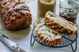 Ready to cut sweet bread, a loaf of peanut butter and jelly babka
