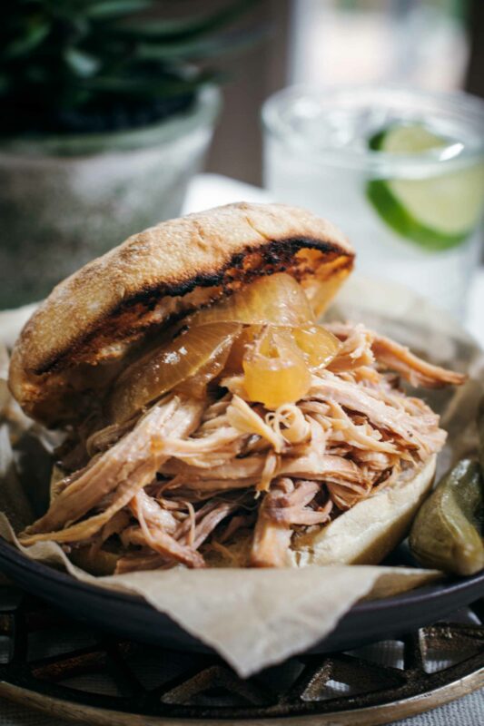 This Pulled Pork Sandwich! It is such a classic, easy to make and is perfect for summer, fall, or any time of year! Cook it in the oven or put it in the slow cooker for 6 – 8 hours to cook it low and slow.