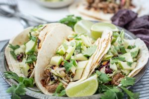 Carnitas BBQ pulled pork tacos with apple salsa and a lime slice