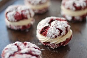 Gorgeous tasting Red Velvet soft and chewy cookies sandwiched with delicious Cream Cheese Icing!
