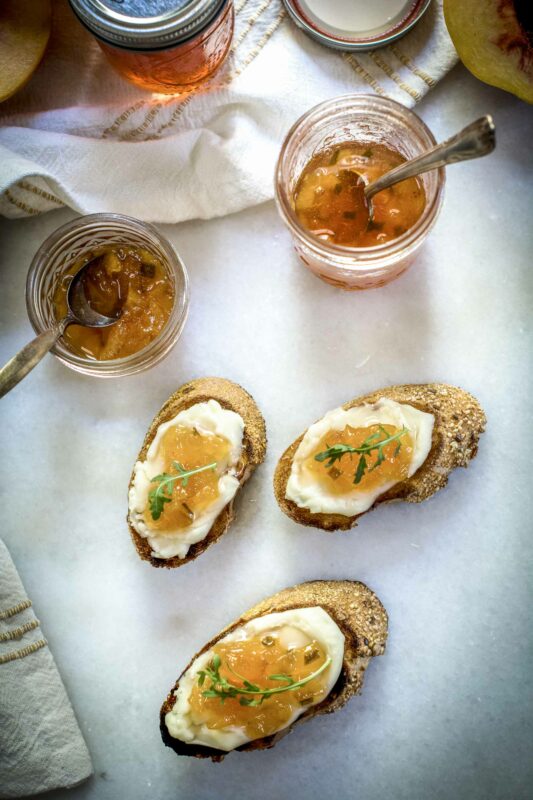 - Simply top toasted baguette slices with creamy brie and a spoon of Pepper Peach Jam! (Pictured in post)