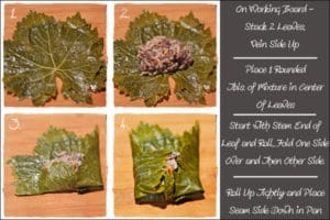 A step-by-step guide to making Stuffed Grape Leaves, showing leaves with filling in the center, folding the sides, rolling up tightly, and written instructions on the right side of the image.