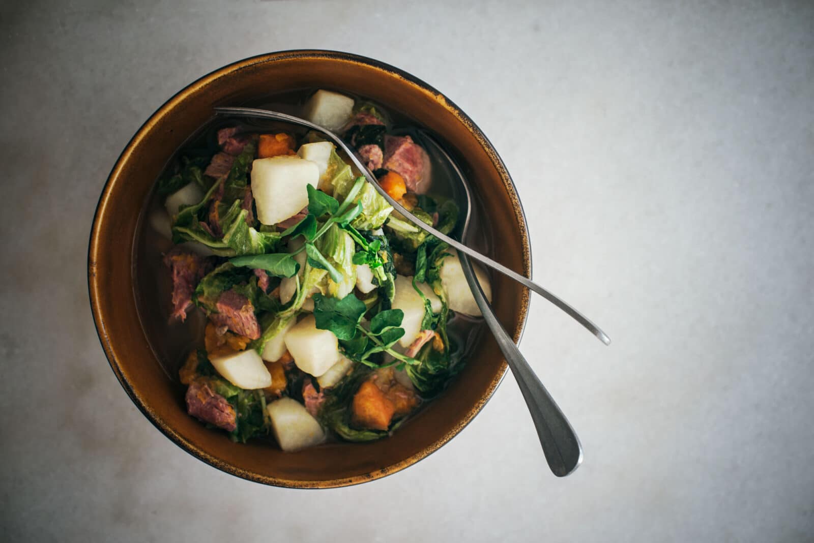 A comforting one-pot dish combining root vegetables, protein, and broth, common in Māori and Southern U.S. cuisines.